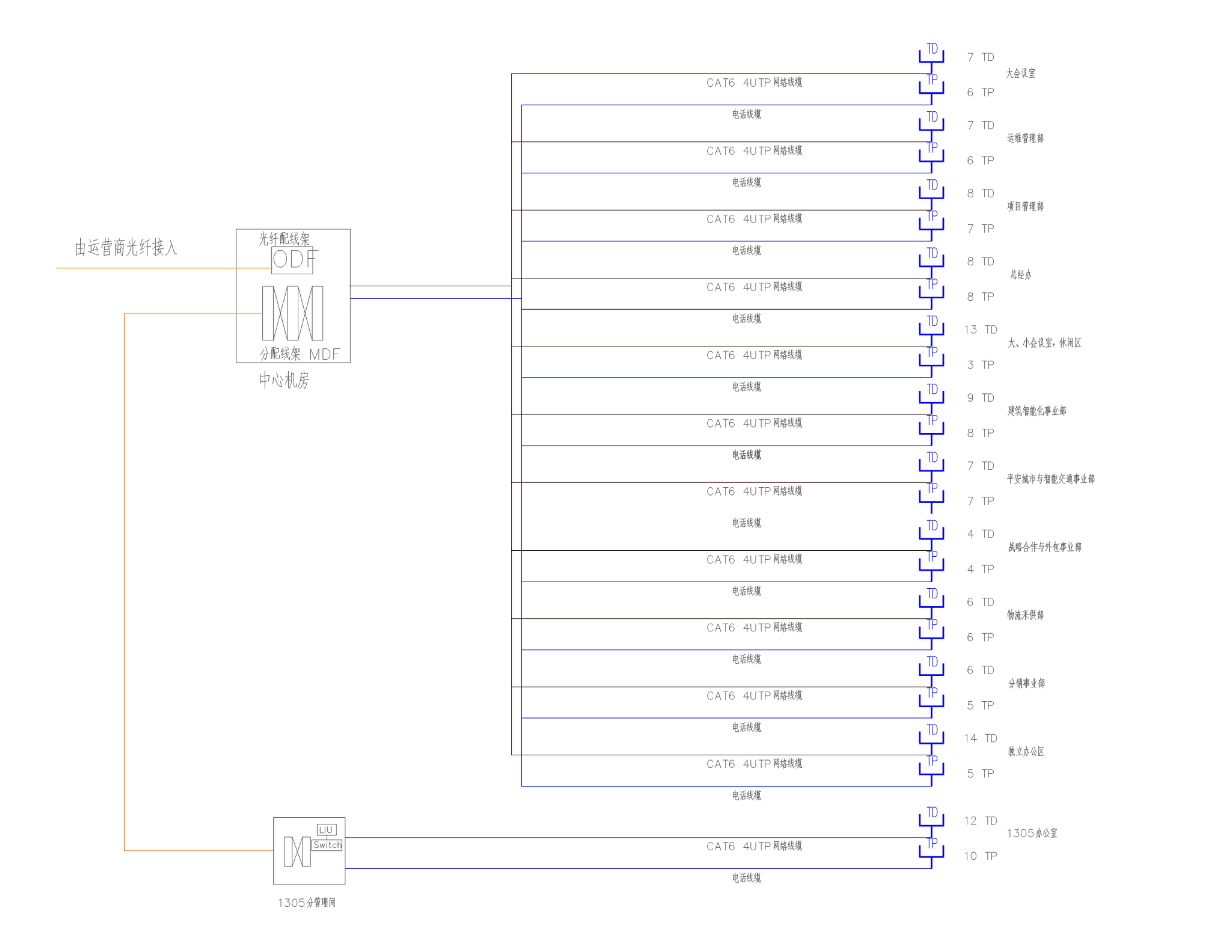 2、建立有效的通信自動化系統,實現電信的虛擬電話接入、建立電話程控交換系統,實現樓內無線移動電話(電信、移動、聯通)信號覆蓋。